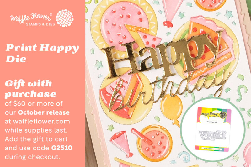 Waffle Flower is offering a free gift with purchase! If you purchase $60 or more from the Sweet Gatherings Release, you will get the new Print Happy Die. NOTE: In order to receive the free gift, make sure to ADD the product to your cart and then apply code “G2510” during checkout.