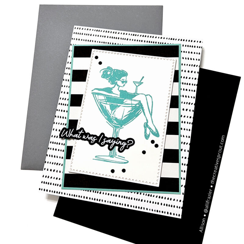 Isn’t this sentiment hilarious? Listen, it doesn’t take alcohol to make me forget things, so I can relate to this. If it said “Where did I put my scissors?”, that would also resonate with me. This sentiment is one of many that comes in the Martini Mood set, and this time I foiled the plate with white opaque foil. The black dots that I used as embellishments come from the next card!