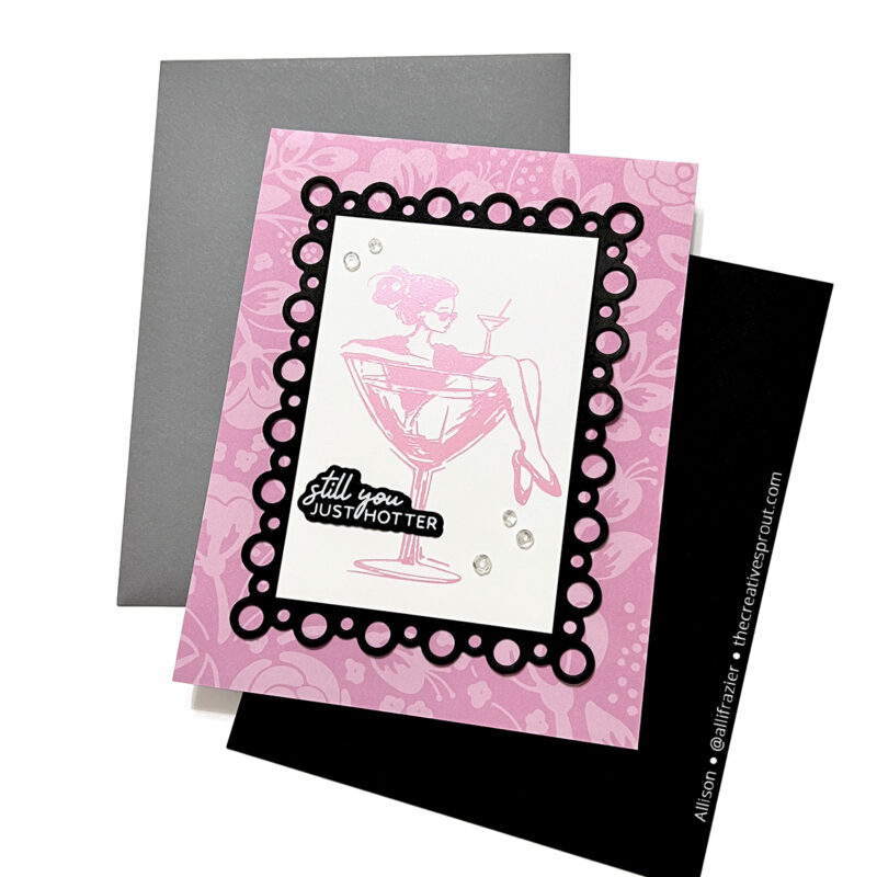 This second card features foiling the Martini Mood image. I foiled it with pink satin pastel foil on white card stock. I trimmed the panel down to fit on top of this fun frame that comes from the Nested Tree Frame Die Set. And speaking of this frame, all of the little circles that pop out of those openings can come in handy – don’t throw them away! I used the smaller circles as an embellishment on my first card above. This is a great way to add embellishments without adding bulk to your cards. For this card, I did add some sparkly, clear sequins for a bit of bling. The pink floral patterned paper comes from the Just Sayin’ 6 x 6 Paper Pack.