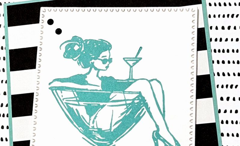 Because Martini Mood is a BetterPress plate, that means it’s great for either inking or foiling. For this first card, I used some new-ish BetterPress ink from Dina Wakley. I used the turquoise ink, along with the BetterPress Letterpress System, to ink up the image on white card stock. I then trimmed the panel down with the Perfect Touch Rectangles. This rectangle set was part of the original Happy Hour collection from last year, and it’s still one of my go-to sets. I set this against some wonky angles of patterned paper. The bold black and white striped paper comes from the Crafty Babe Collection Kit. The background patterned paper comes from an old pack from Honey Bee called Back to Basics. I don’t believe this is available anymore, but any black and white patterned paper would be fun to offset against that bold striped paper.