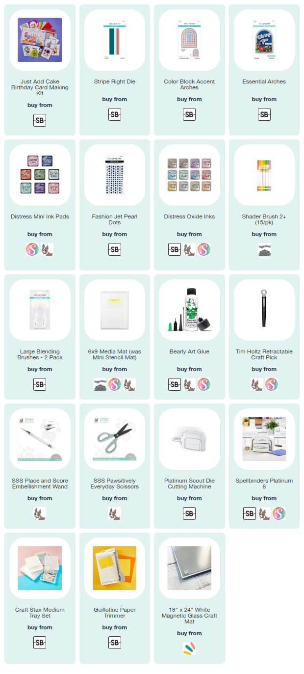 Hello, friends and happy Friday! It is a very happy day, since I get to help introduce the new Just Add Cake Birthday Card Making Kit from Spellbinders! I know some of you have probably already seen sneaks of this kit, and I know there is a lot of excitement around it. There are tons of goodies in this kit to help you make fabulous birthday cards, including seven (yes, SEVEN) die sets. I have a video today which shares my unboxing of the kit, along with three cards that I made. There are also some add-ons in the collection that are available for this kit. I used both the Stripe Right die and the Color Block Accent Arches in very subtle ways on my cards today.