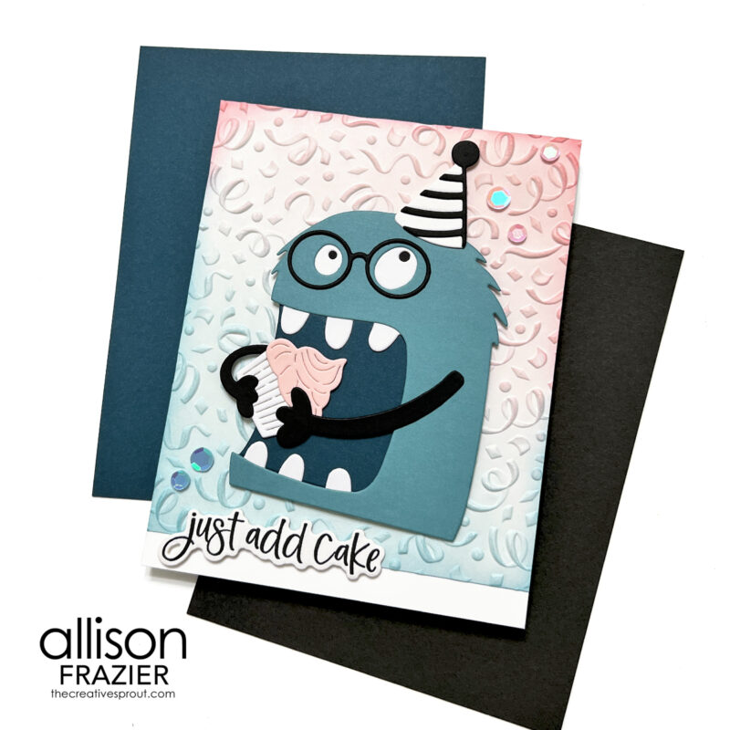 My first card features the Chompster die set from the kit. Isn’t he adorable?? Other items from the kit that I used include the Just Add Cake stamp set and matching die set, the Confetti Drop 3D Embossing Folder, some of the ColorWheel Card Stock, and a few of the sequins.