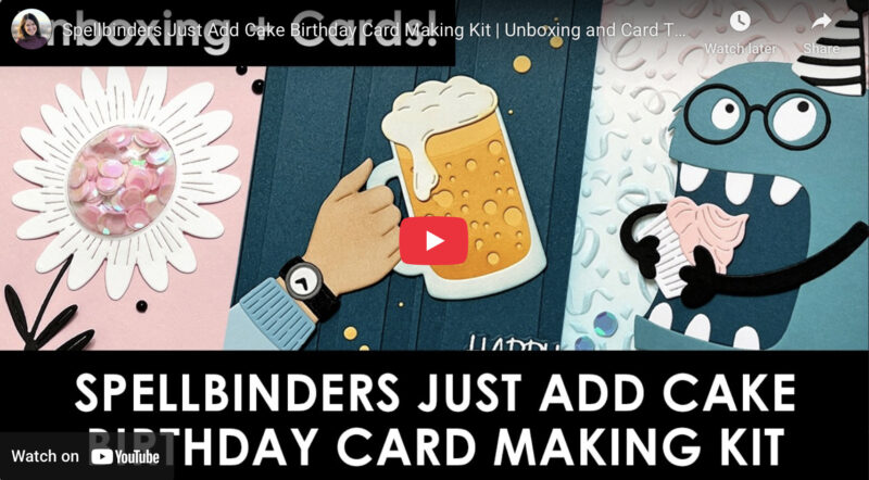 Hello, friends and happy Friday! It is a very happy day, since I get to help introduce the new Just Add Cake Birthday Card Making Kit from Spellbinders! I know some of you have probably already seen sneaks of this kit, and I know there is a lot of excitement around it. There are tons of goodies in this kit to help you make fabulous birthday cards, including seven (yes, SEVEN) die sets. I have a video today which shares my unboxing of the kit, along with three cards that I made. There are also some add-ons in the collection that are available for this kit. I used both the Stripe Right die and the Color Block Accent Arches in very subtle ways on my cards today.